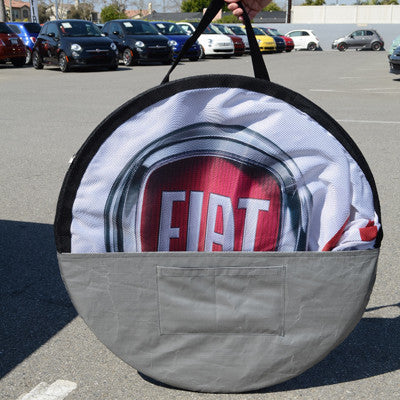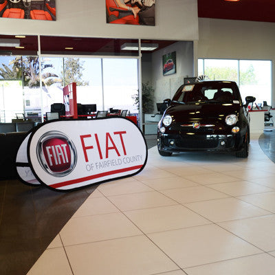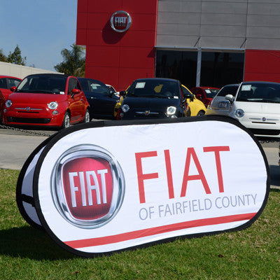 Create instant advertising with this custom double sided and highly visible Pop Up Banner. The heavy duty steel frame and light weight polyester twists and folds down to fit into a convenient portable carry case. Can be used indoors or outdoors. Banner has velcro distancing straps for extra stability. Secure to soft ground with four metal ground spikes(included) or add sand bags on top of inside straps for extra support. Banner is 6 1/2ft wide x 3ft tall and oval in shape. Printed on both sides in high quality full color digital printing. Minimum order of only 1 banner!