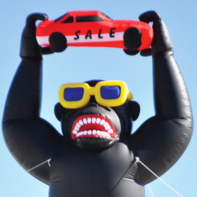 Guaranteed to make them look! This Giant 20' Gorilla inflatable is black with yellow shorts, sunglasses and holding a "SALE" car! 20 feet tall and made of durable PVC Tarpaulin. The kit includes the 20' Gorilla, blower, sand bags, ropes and repair kit.