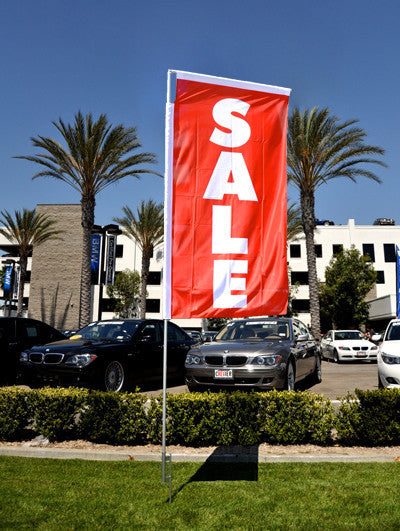 Draw attention with minimal effort with these 1o ft. tall giant flag kits!. Great for the front line or highlighting any vehicle. Unique design allows this flag to "fly" even when there is no wind. Flag rotates into the wind. Each Kit includes one flag of your choice, a 3-piece flag pole and a spike base designed to be used in the ground. Each single sided polyester flag is 3 feet wide x 6 feet tall and has two sewn sleeves that easily slip over the specially designed flag pole. The 3-piece flag pole is made of anodized aluminum and is slightly over 10 feet tall. The ground spike base is made of anodized aluminum. Available in 19 different eye-catching designs.
