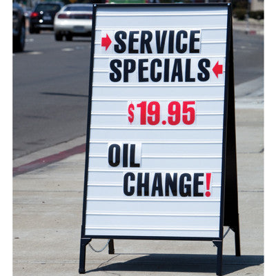 A showroom sign for indoors or out. This two-sided sign is easy to use and easy to move. 41" tall x 21" wide, it is made of sturdy heavy gauge steel with white plastic front & back easy change message boards. Includes over 300 4" tall reuseable numbers and letters (red numbers & highlights, black letters)