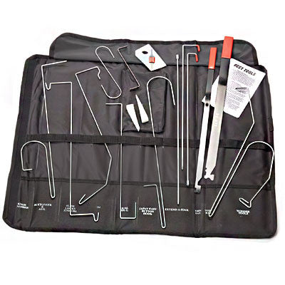 Complete vehicle entry package. Comes with 18 different tools for easy entry into any car. Three-fold case protects and organizes tools. Labeled pockets for easy tool identification.