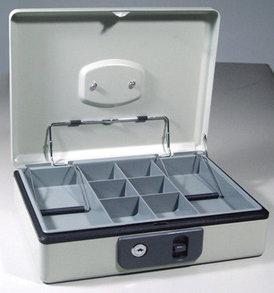 Made of heavy guage seemless steel, light grey in color. This Cash Box includes two keys has a felt lined bottom and auto opening lid with a patented lever with a plastic inner tray. 3" H x 11.75" W x 9" D