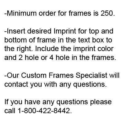 When ordering, please note the following in the information field shown above. (1) Desired imprint on top & bottom panels. (2) Desired Imprint Color (colors available: White, Yellow, Red, Green, Blue, Orange, Gold ($0.12 extra per piece) or Chrome ($0.12 extra per piece) Each additional color imprint is an additional $0.25 per frame. (3) Whether you want 2 or 4 holes. We will fax over a layout for approval. Any changes other than corrections, may incur an art charge. Please note the color Gold is not guaranteed due to its tendency to fade under certain weather conditions.