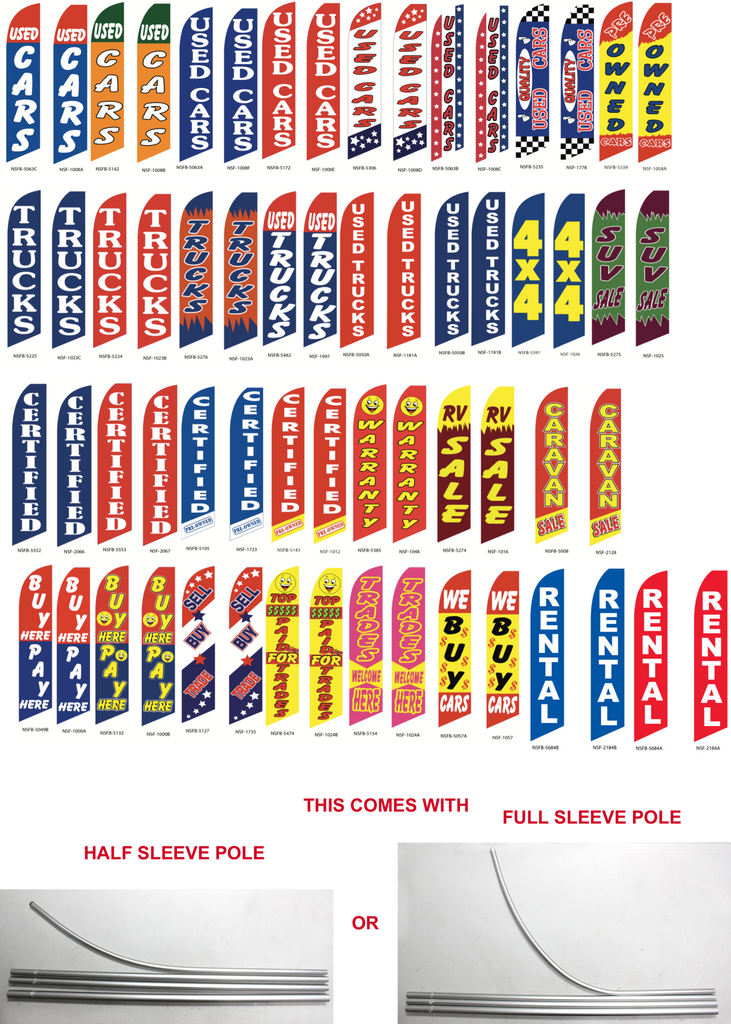 Draw attention with minimal effort with these 15 ft. tall giant flag kits!. Great for the front line or highlighting any vehicle, these flags flutter & flap with a slight breeze. However, unique design allows this flag to "fly" even when there is no wind. Completely portable, a flag can be moved any where on your lot in minutes. Each Kit includes one flag of your choice, a 4-piece flag pole and a "kick under the tire" base designed to be used under the tire of any vehicle. Each flag is 2 feet 5 1/2 inches wide x 11 feet 5 3/4 inches tall and has a sewn sleeve that easily slips over the specially designed flag pole. The 4-piece flag pole is made of anodized aluminum and is slightly over 15 feet tall. The u-shaped wheel base stand is made of galvanized steel and is designed to be kicked under the tire of any vehicle.